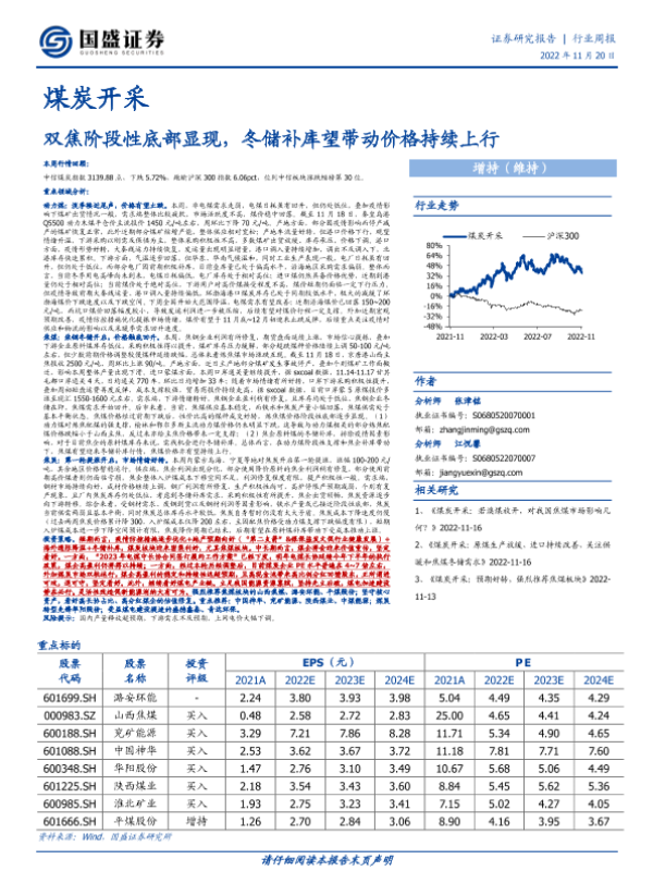 【国盛证券】【20221120】20221120-国盛证券-煤炭开采行业周报:双焦阶段性底部显现,冬储补库望带动价格持续上行-18页 行业研究