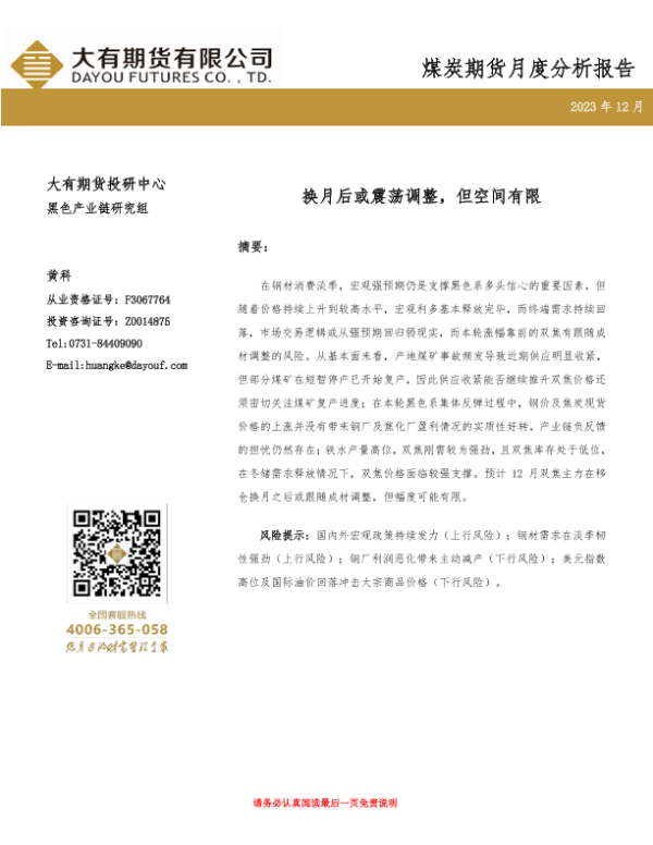 【大有期货】【20231203】煤炭期货月度分析报告:换月后或震荡调整,但空间有限-10页 行业研究