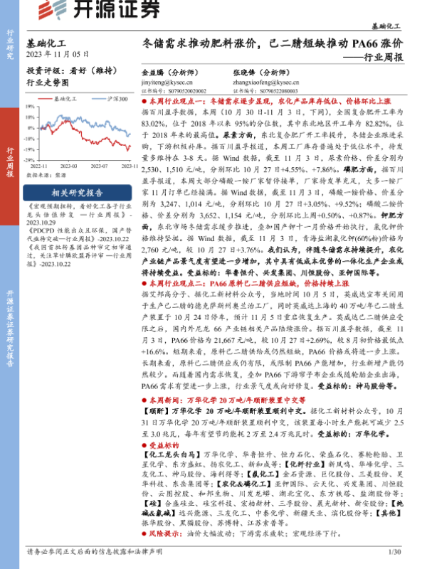 【开源证券】【20231105】20231105-开源证券-基础化工行业周报:冬储需求推动肥料涨价,己二腈短缺推动PA66涨价-30页 行业研究