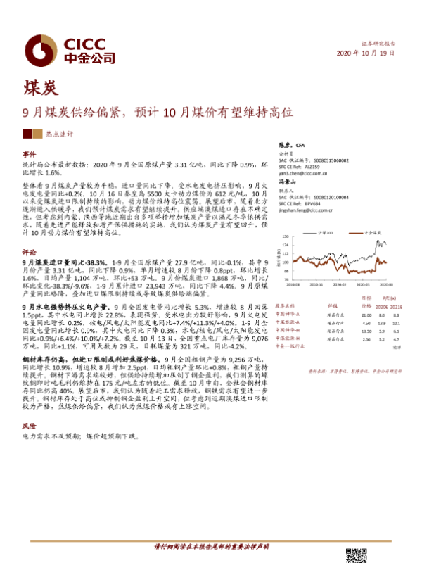 【中金公司】【20201019】煤炭热点速评:9月煤炭供给偏紧,预计10月煤价有望维持高位-4页 行业研究