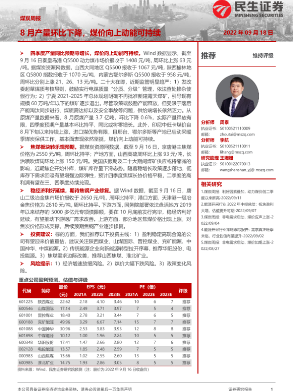 【民生证券】【20220918】20220918-民生证券-煤炭周报:8月产量环比下降,煤价向上动能可持续-19页 行业研究