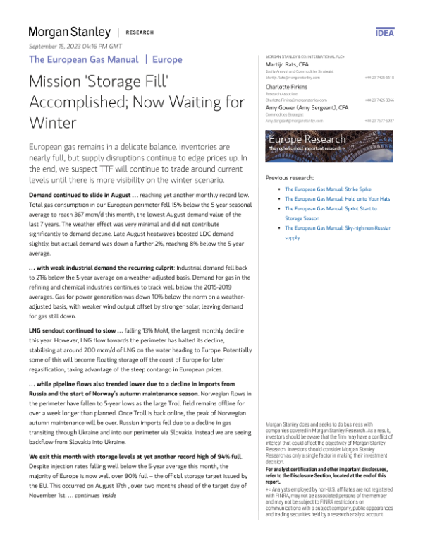 【Morgan Stanley】【2023】The European Gas Manual Mission 'Storage Fill' Accomplished; Now Waiting for Winter-27页 行业研究