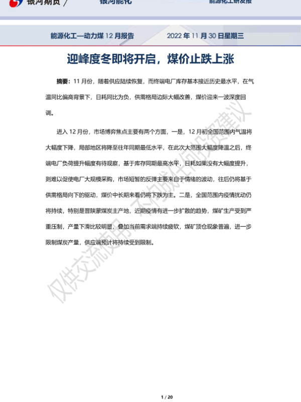 【银河期货】【20221130】能源化工_动力煤12月报告:迎峰度冬即将开启,煤价止跌上涨-20页 行业研究