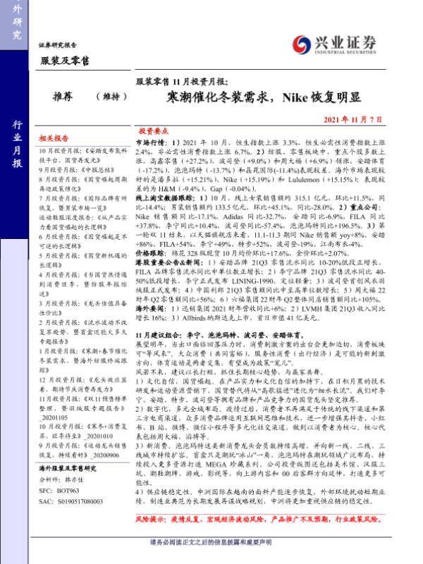 【兴业证券】【20211107】寒潮催化冬装需求,Nike恢复明显-20页 行业研究
