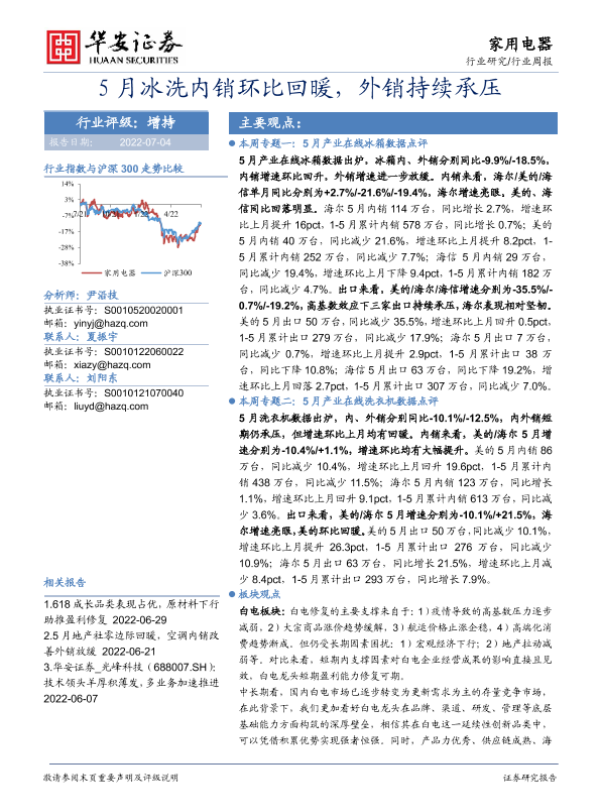 【华安证券】【20220704】20220704-华安证券-家用电器行业周报:5月冰洗内销环比回暖,外销持续承压-21页 行业研究