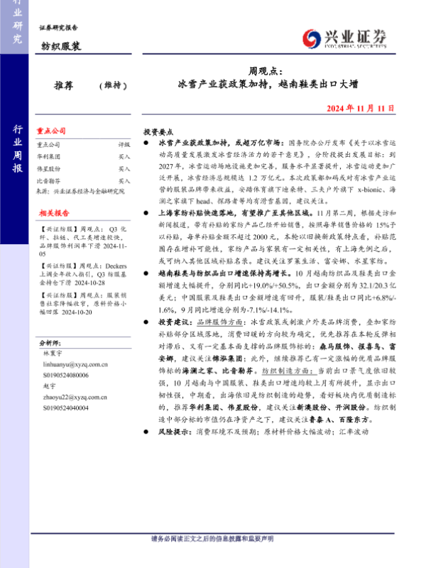 【兴业证券】【20241111】周观点:冰雪产业获政策加持,越南鞋类出口大增-11页 行业研究