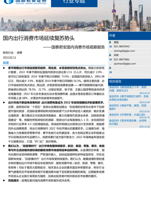 【国泰君安证券】【20220211】国内出行消费市场延续复苏势头-2页 行业研究