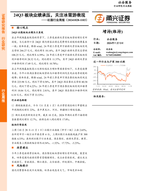 【甬兴证券】【20241113】24Q3板块业绩承压,关注冰雪游表现-10页 行业研究