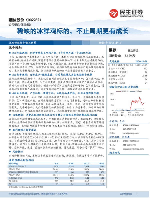 【民生证券】【20201021】20201021-民生证券-湘佳股份-002982.SZ-稀缺的冰鲜鸡标的,不止周期更有成长-37页 行业研究
