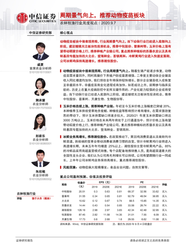 【中信证券】【20200907】20200907-中信证券-农林牧渔行业周度观点:周期景气向上,推荐动物疫苗板块-8页 行业研究