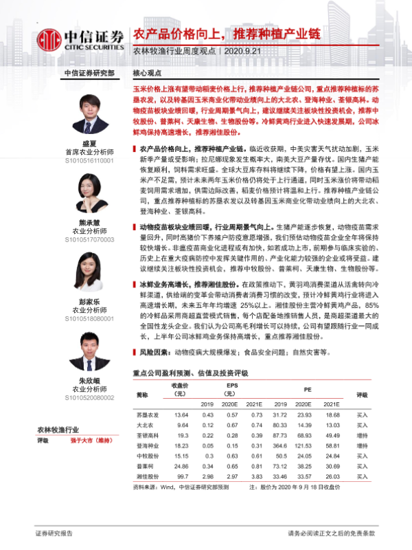 【中信证券】【20200921】20200921-中信证券-农林牧渔行业周度观点:农产品价格向上,推荐种植产业链-8页 行业研究
