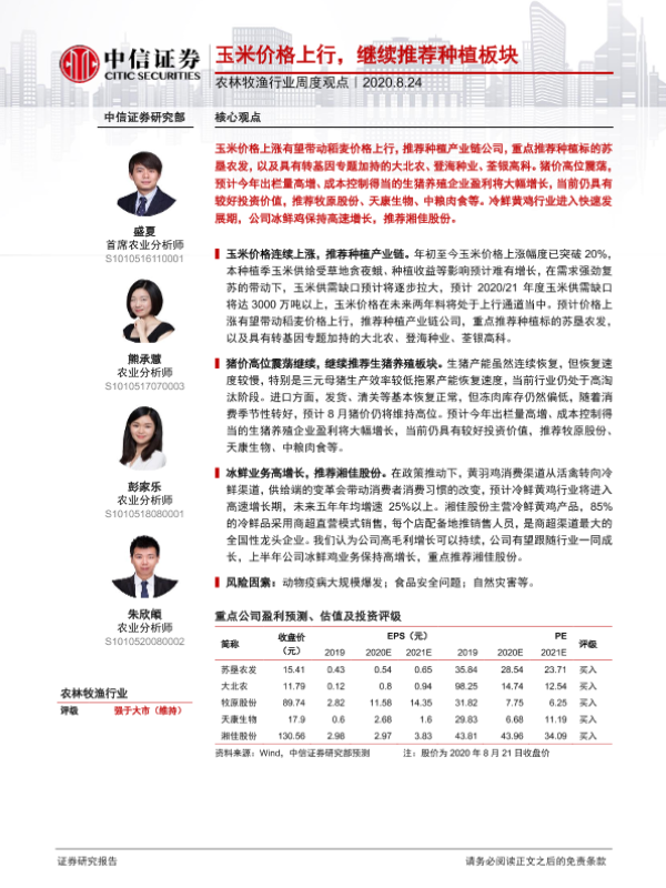 【中信证券】【20200824】20200824-中信证券-农林牧渔行业周度观点:玉米价格上行,继续推荐种植板块-9页 行业研究