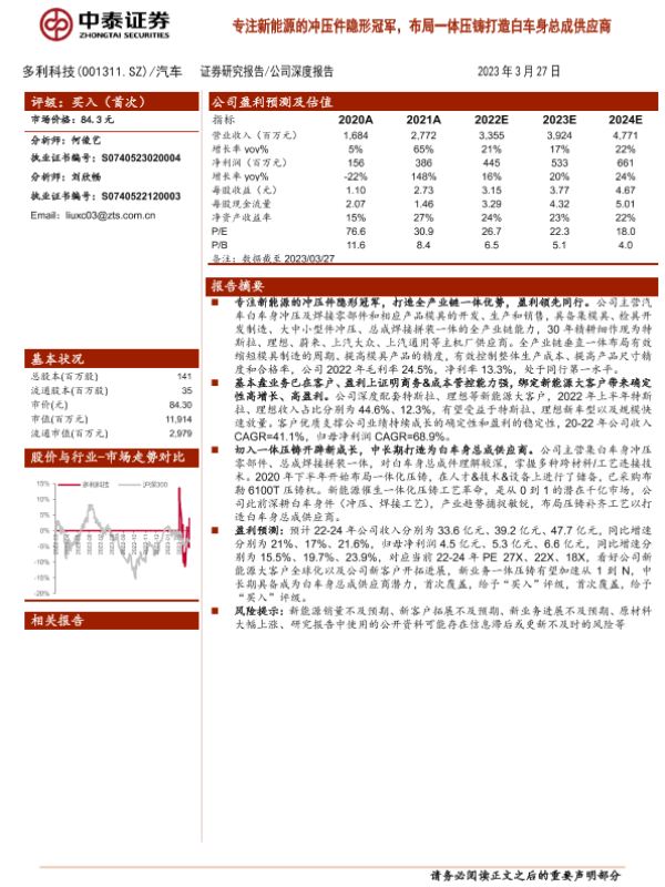 【中泰证券】【20230327】多利科技-专注新能源的冲压件隐形冠军,布局一体压铸打造白车身总成供应商-18页 行业研究
