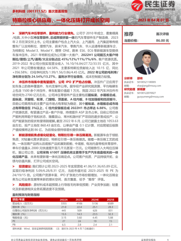 【民生证券】【20230407】20230407-民生证券-多利科技-001311.SZ-首次覆盖报告:特斯拉核心供应商,一体化压铸打开成长空间-28页 行业研究