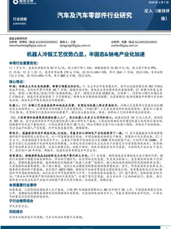【国金证券】【20240107】汽车及汽车零部件行业研究:机器人冷锻工艺优势凸显,半固态&钠电产业化加速-17页 行业研究