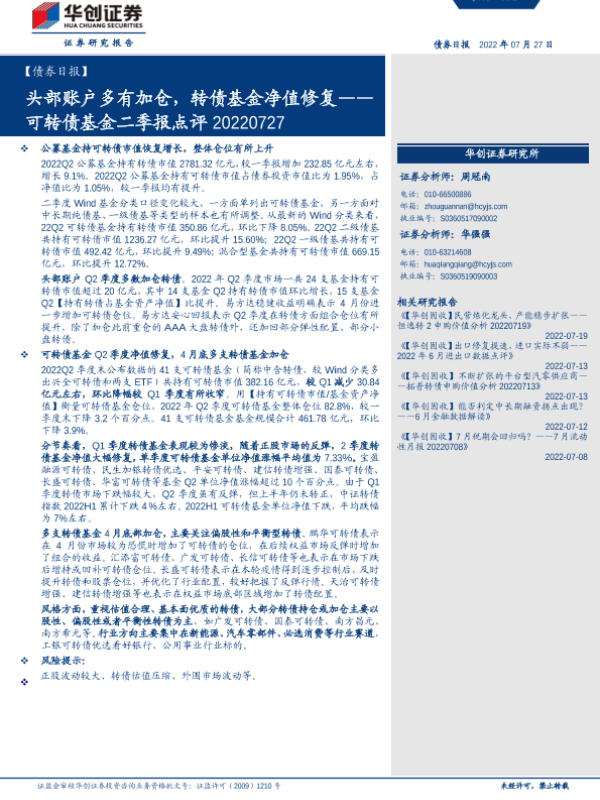 【华创证券】【20220727】可转债基金二季报点评:头部账户多有加仓,转债基金净值修复-19页 行业研究