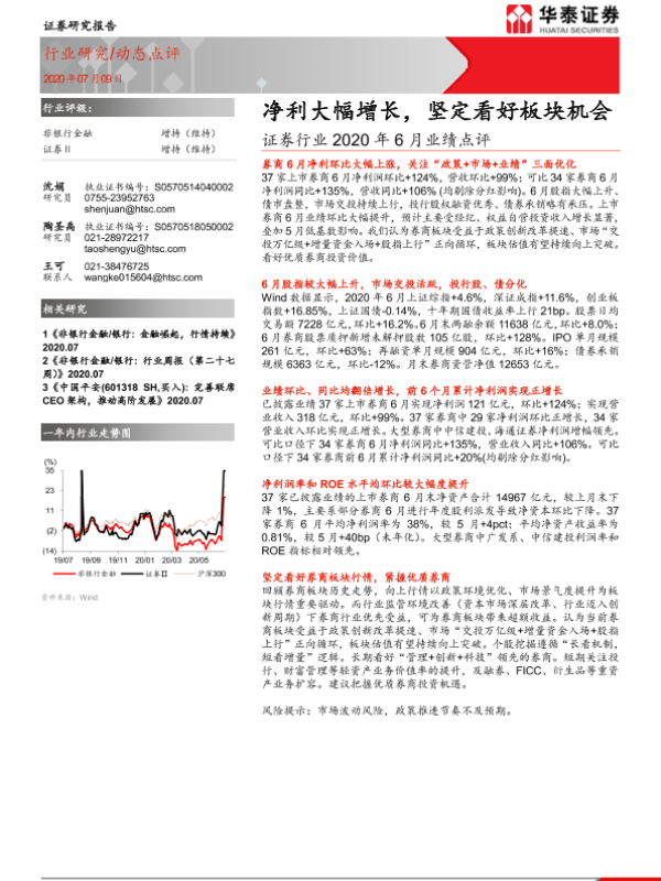 【华泰证券】【20200709】证券行业2020年6月业绩点评:净利大幅增长,坚定看好板块机会-4页 行业研究