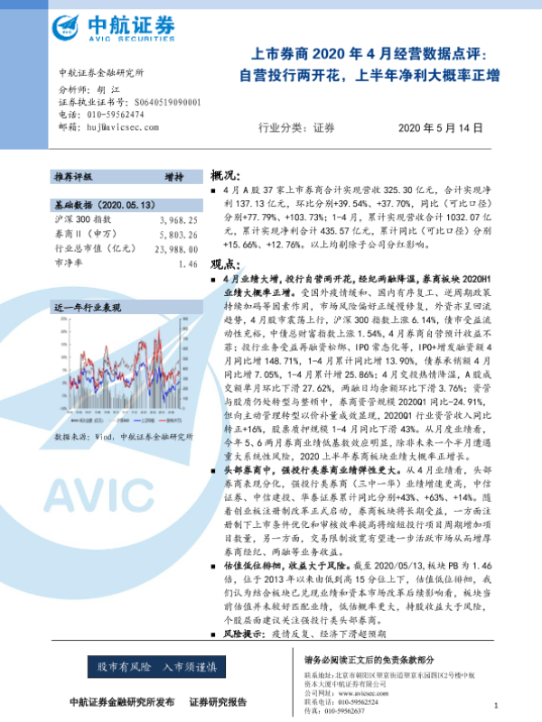 【中航证券】【20200514】上市券商2020年4月经营数据点评:自营投行两开花,上半年净利大概率正增-5页 行业研究