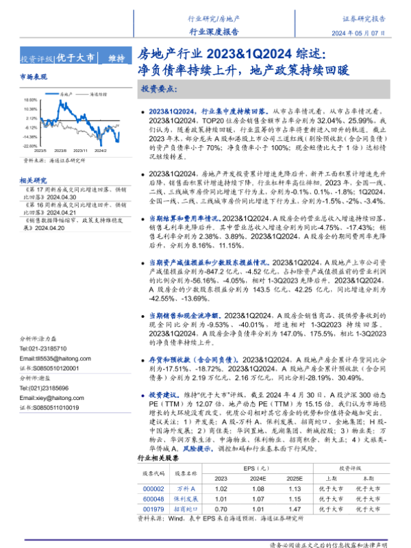 【海通证券】【20240507】房地产行业2023&1Q2024综述:净负债率持续上升,地产政策持续回暖-24页 行业研究
