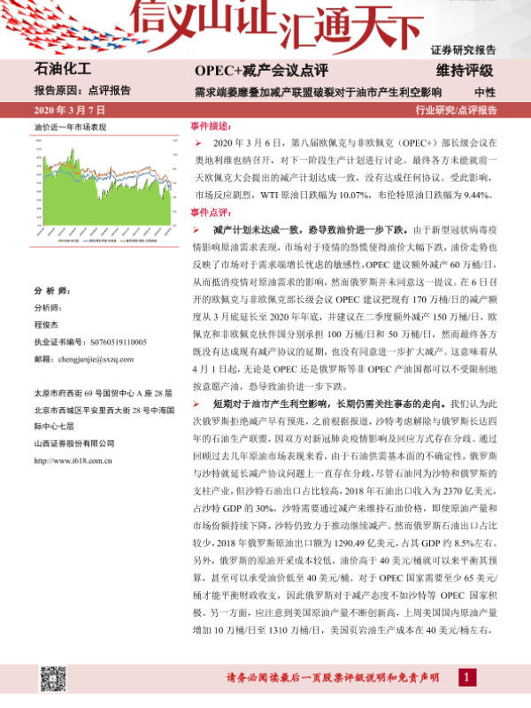 【山西证券】【20200307】OPEC+减产会议点评:需求端萎靡叠加减产联盟破裂对于油市产生利空影响-3页 行业研究