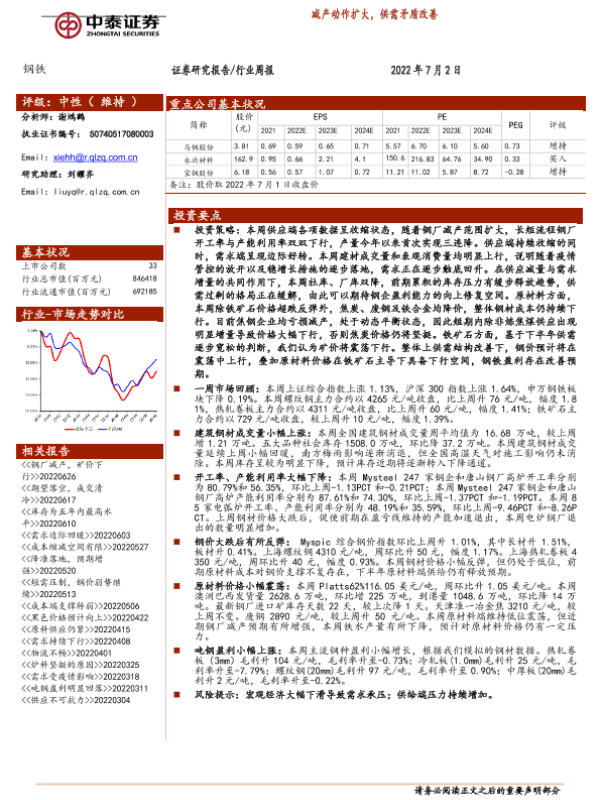【中泰证券】【20220702】20220702-中泰证券-钢铁行业周报:减产动作扩大,供需矛盾改善-12页 行业研究