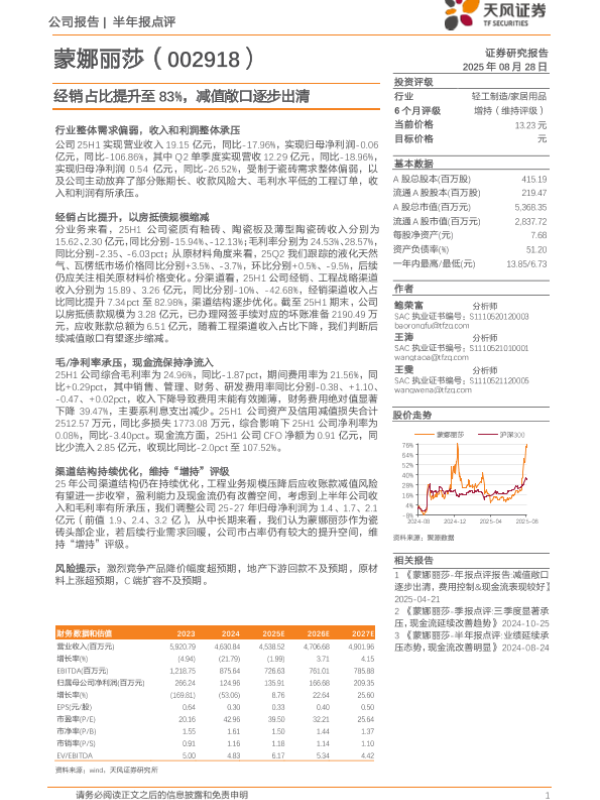 【天风证券】【20250828】蒙娜丽莎-经销占比提升至83%,减值敞口逐步出清-3页 证券期货研究报告