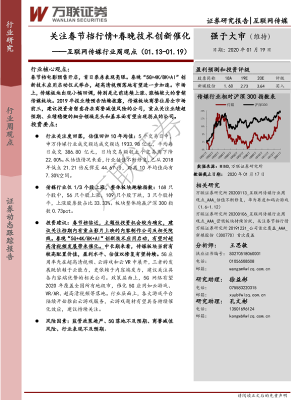 【万联证券】【20200119】20200119-万联证券-互联网传媒行业周观点:关注春节档行情+春晚技术创新催化-12页 行业研究