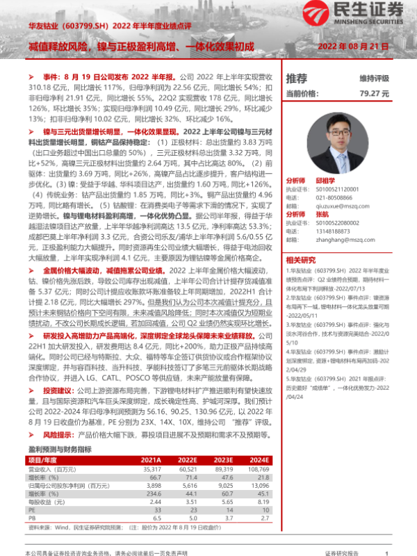 【民生证券】【20220821】华友钴业(603799.SH)2022年半年度业绩点评_减值释放风险_镍与正极盈利高增_一体化效果初成-24页 行业研究