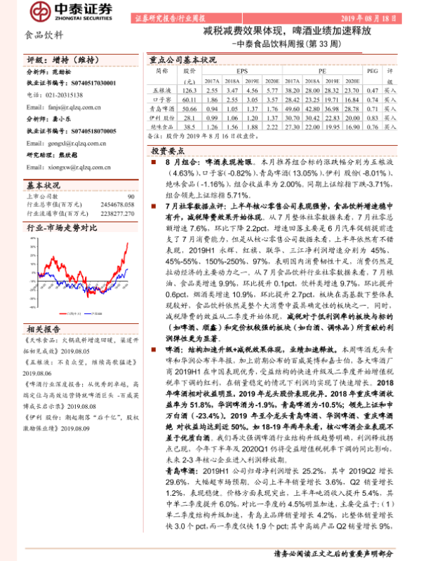 【中泰证券】【20190818】食品饮料行业周报(第33周):减税减费效果体现,啤酒业绩加速释放-12页 行业研究