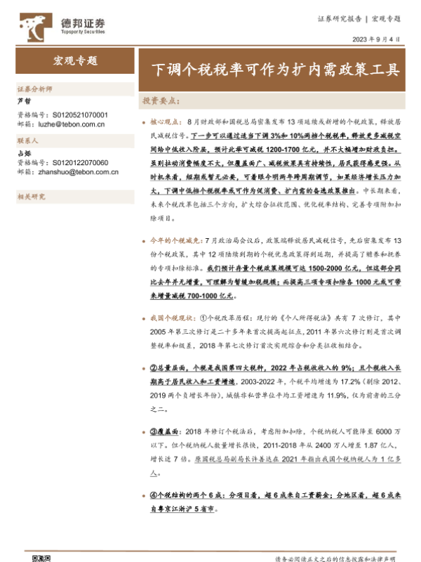 【德邦证券】【20230904】宏观专题:下调个税税率可作为扩内需政策工具-17页 行业研究