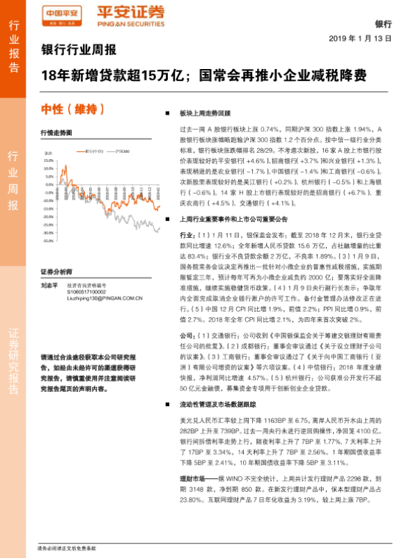 【平安证券】【20190113】银行行业周报:18年新增贷款超15万亿;国常会再推小企业减税降费-14页 行业研究