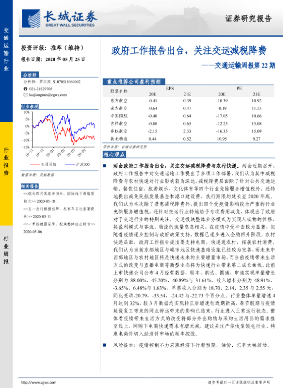 【长城证券】【20200525】交通运输周报第22期:政府工作报告出台,关注交运减税降费-20页 行业研究
