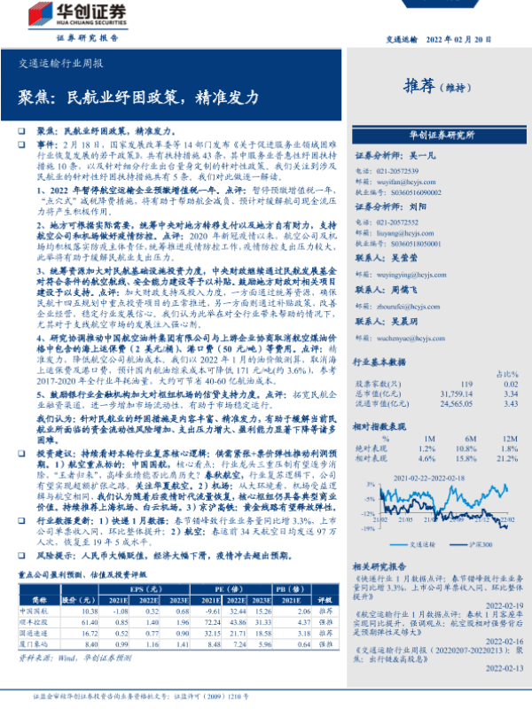 【华创证券】【20220220】交通运输行业周报:聚焦民航业纾困政策,精准发力-16页 行业研究