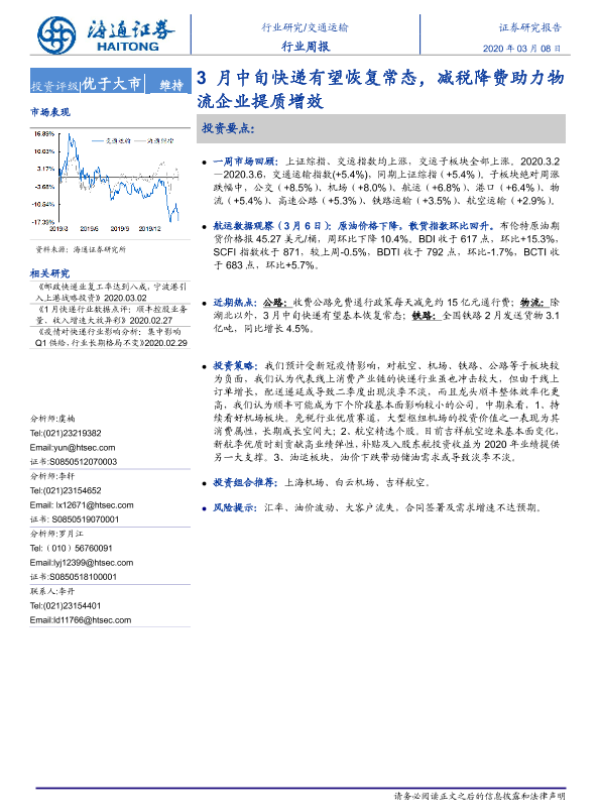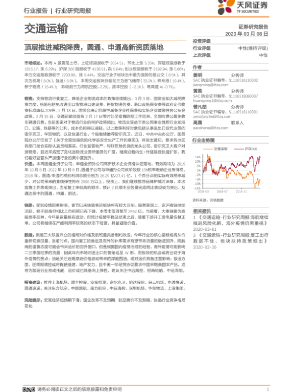 【天风证券】【20200308】交通运输行业研究周报:顶层推进减税降费,圆通、申通高新资质落地-13页 行业研究