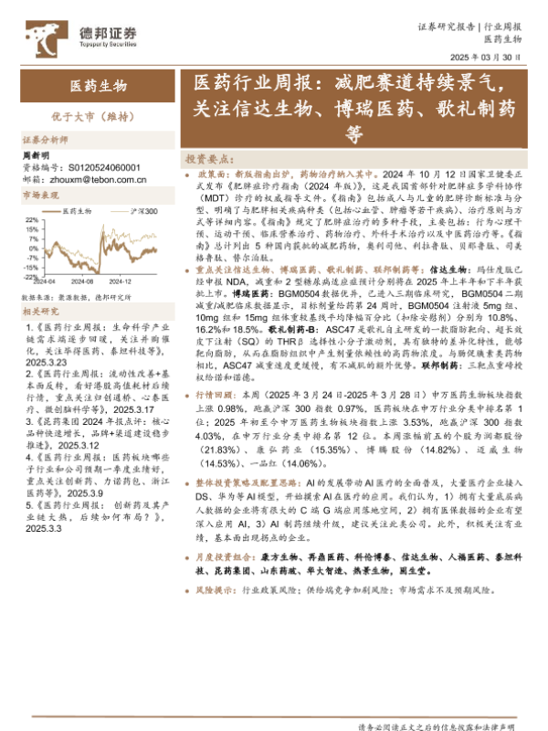 【德邦证券】【20250330】20250330-德邦证券-医药行业周报:减肥赛道持续景气,关注信达生物、博瑞医药、歌礼制药等-12页 行业研究