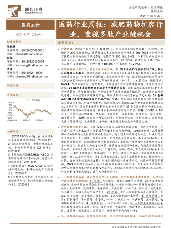 【德邦证券】【20230625】医药行业周报:减肥药物扩容行业,重视多肽产业链机会-20页 行业研究