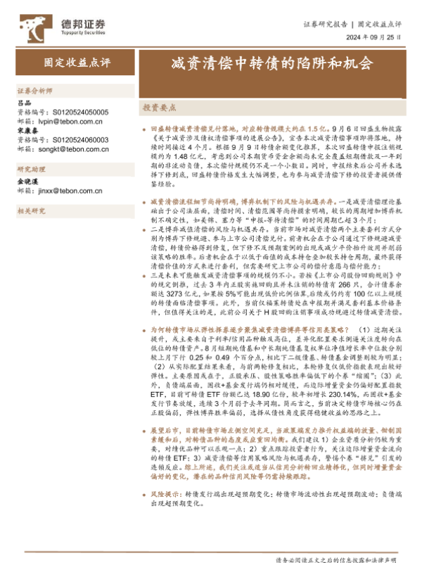 【德邦证券】【20240925】固定收益点评:减资清偿中转债的陷阱和机会-10页 行业研究