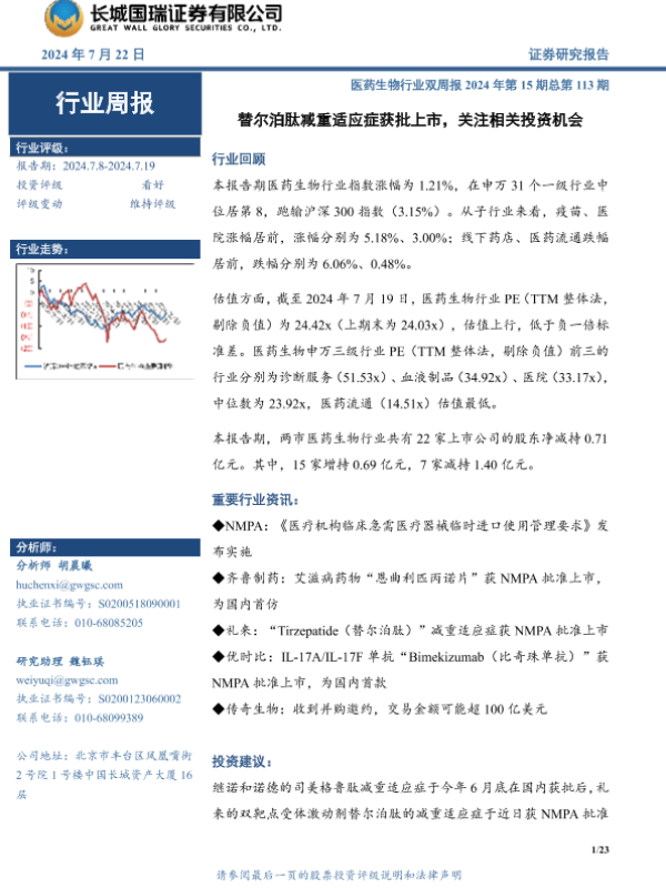 【长城国瑞证券】【20240722】医药生物行业双周报2024年第15期总第113期:替尔泊肽减重适应症获批上市,关注相关投资机会-23页 行业研究