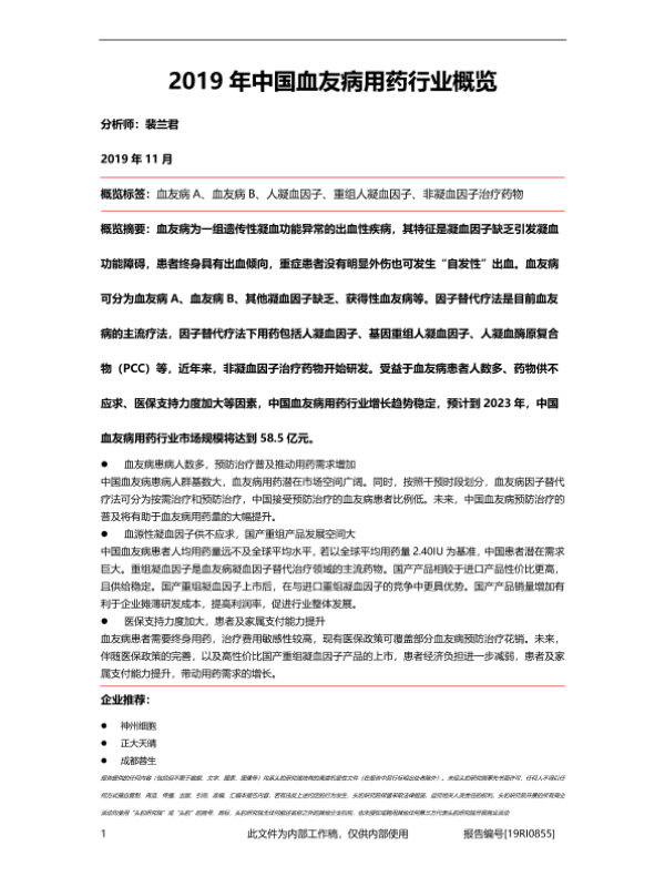【头豹研究院】【201911】2019年中国血友病用药行业概览-39页 行业研究