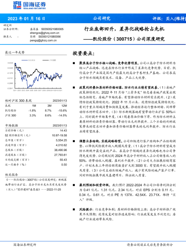 【国海证券】【20230116】行业底部回升,差异化战略抢占先机——凯伦股份(300715)公司深度研究-26页 行业研究