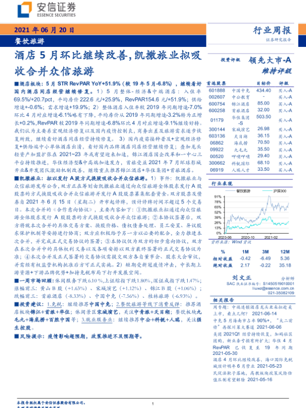 【安信证券】【20210620】餐饮旅游行业周报:酒店5月环比继续改善,凯撒旅业拟吸收合并众信旅游-13页 行业研究