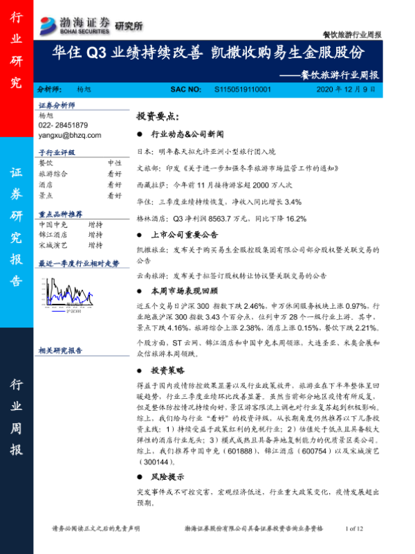 【渤海证券】【20201209】餐饮旅游行业周报:华住Q3业绩持续改善 凯撒收购易生金服股份-12页 行业研究