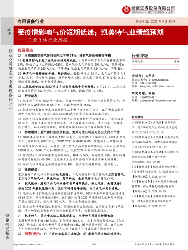 【浙商证券】【20220423】20220423-浙商证券-工业气体行业周报:受疫情影响气价短期低迷;凯美特气业绩超预期-14页 行业研究