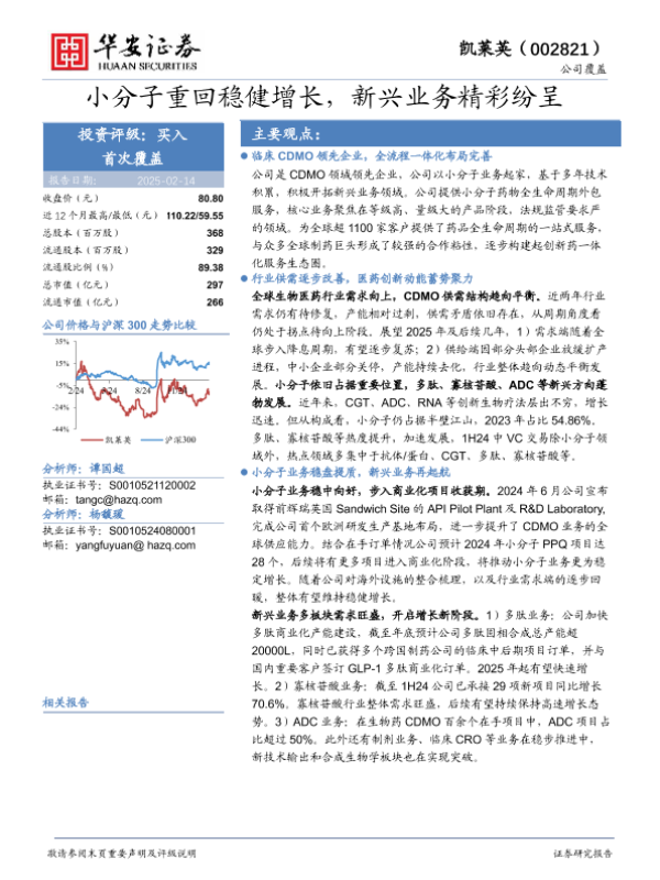 【华安证券】【20250214】20250214-华安证券-凯莱英-002821.SZ-小分子重回稳健增长,新兴业务精彩纷呈-32页 行业研究