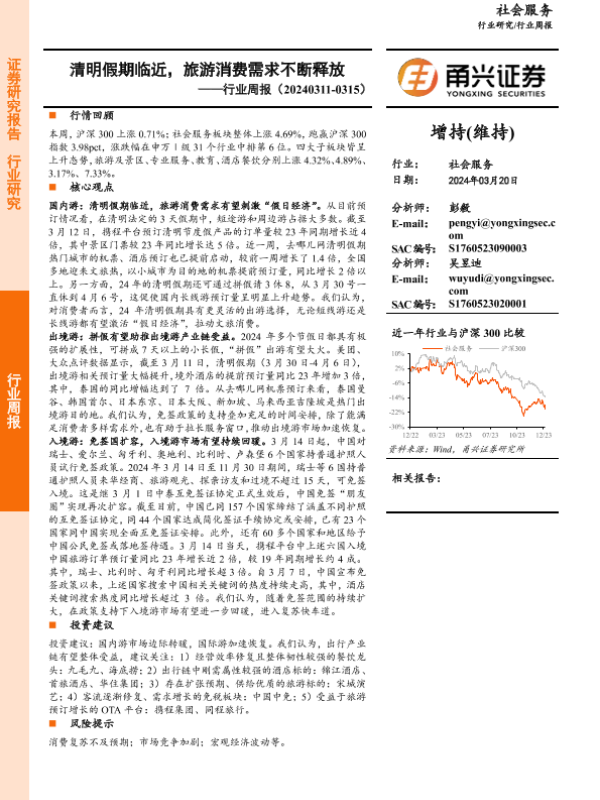 【甬兴证券】【20240320】社会服务行业周报:清明假期临近,旅游消费需求不断释放-12页 行业研究