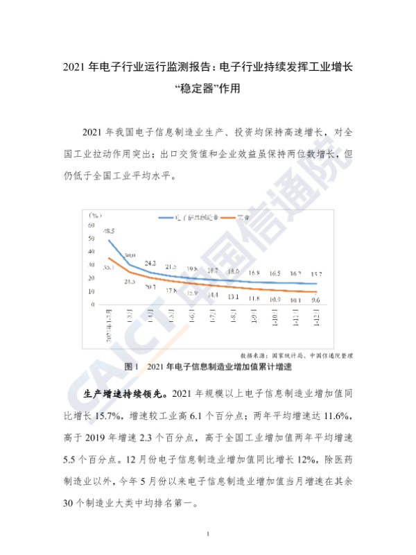 【中国信通院】【20220316】2021年电子行业运行监测报告:电子行业持续发挥工业增长“稳定器”作用-5页 行业研究