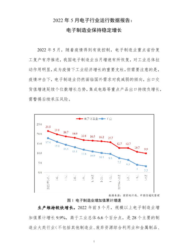 【中国信通院】【20220623】2022年5月电子行业运行数据报告:电子制造业保持稳定增长-5页 行业研究