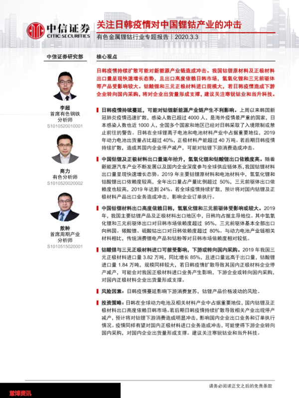 【中信证券】【20200303】关注日韩疫情对中国锂钴产业的冲击-17页 行业研究