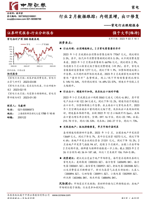 【中原证券】【20230316】20230316-中原证券-家电行业跟踪报告:行业2月数据跟踪:内销显增,出口修复-11页 行业研究