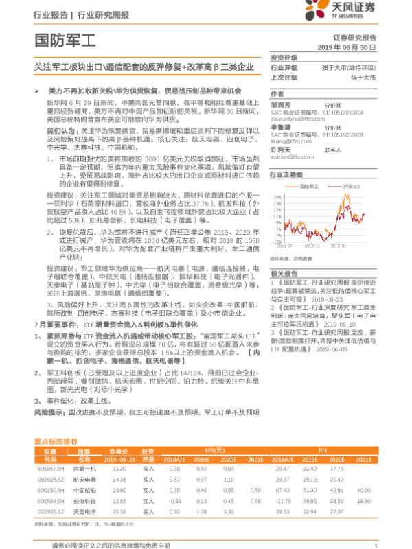 【天风证券】【20190630】国防军工行业研究周报:关注军工板块出口通信配套的反弹修复+改革高β三类企业-2页 行业研究